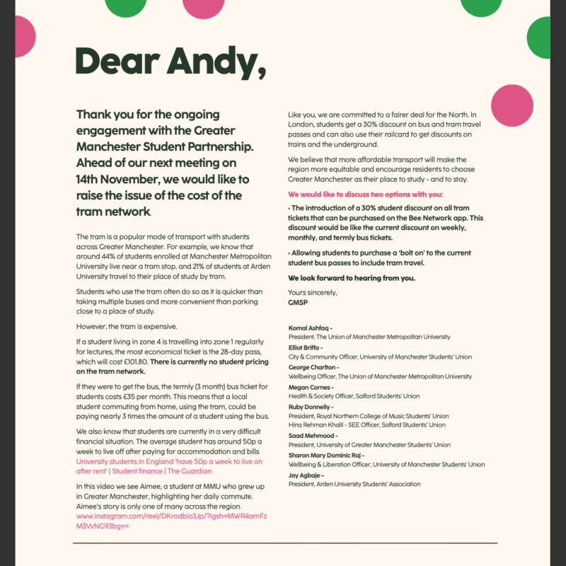 Transport for students should be frequent, safe, reliable, green, and affordable. The GMCA now has control over Transport for Greater Manchester, and we want to work with them to see how students can make the most out of the transport solutions that are on offer.